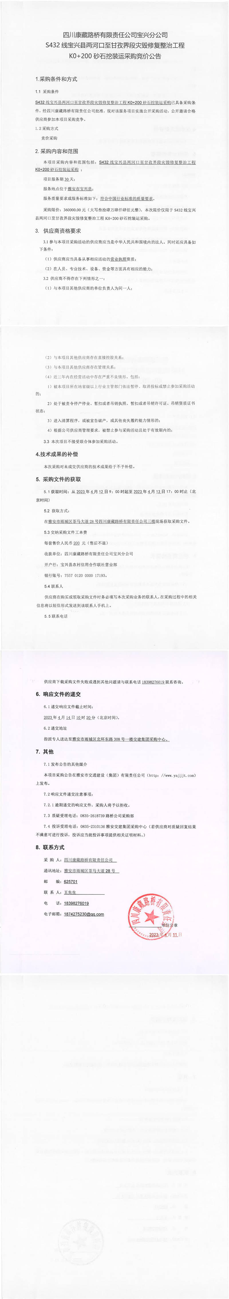 四川康藏路桥有限责任公司宝兴分公司S432宝兴县两河口至甘孜界段灾毁修复整治工程K0+200砂石挖装运采购竞价公告
