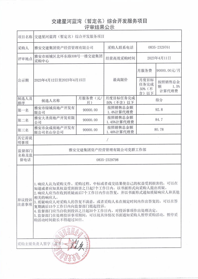 米兰体育-米兰(中国)官网 资产经营管理有限公司交建星河蓝湾(暂定名)综合开发服务项目评审结果公示