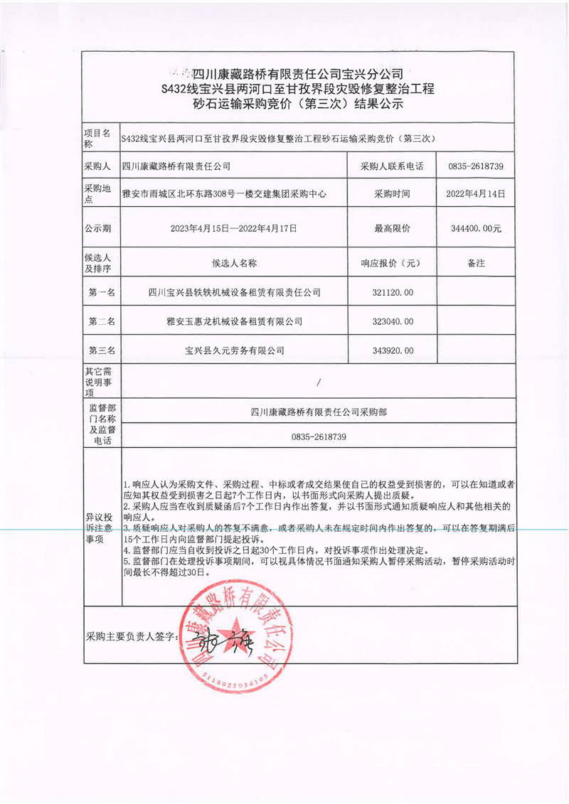 四川康藏路桥有限责任公司宝兴分公司S432线宝兴县两河口至甘孜界段灾毁修复整治工程砂石运输采购竞价(第三次)结果公示