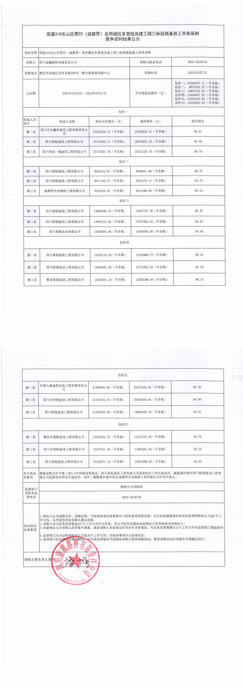 四川康藏路桥有限责任公司国道318名山区黑竹(成都界)至雨城区多营段改建工程三标段路基施工劳务采购竞争谈判结果公示