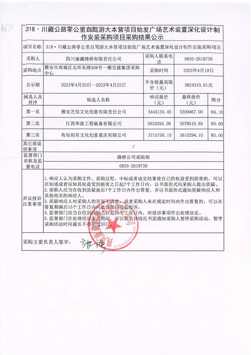 四川康藏路桥有限责任公司318·川藏公路零公里自驾游大本营项目始发广场艺术装置深化设计制作安装采购项目采购结果公示