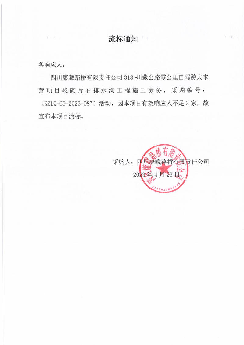 四川康藏路桥有限责任公司318·川藏公路零公里自驾游大本营项目浆砌片石排水沟工程施工劳务流标通知