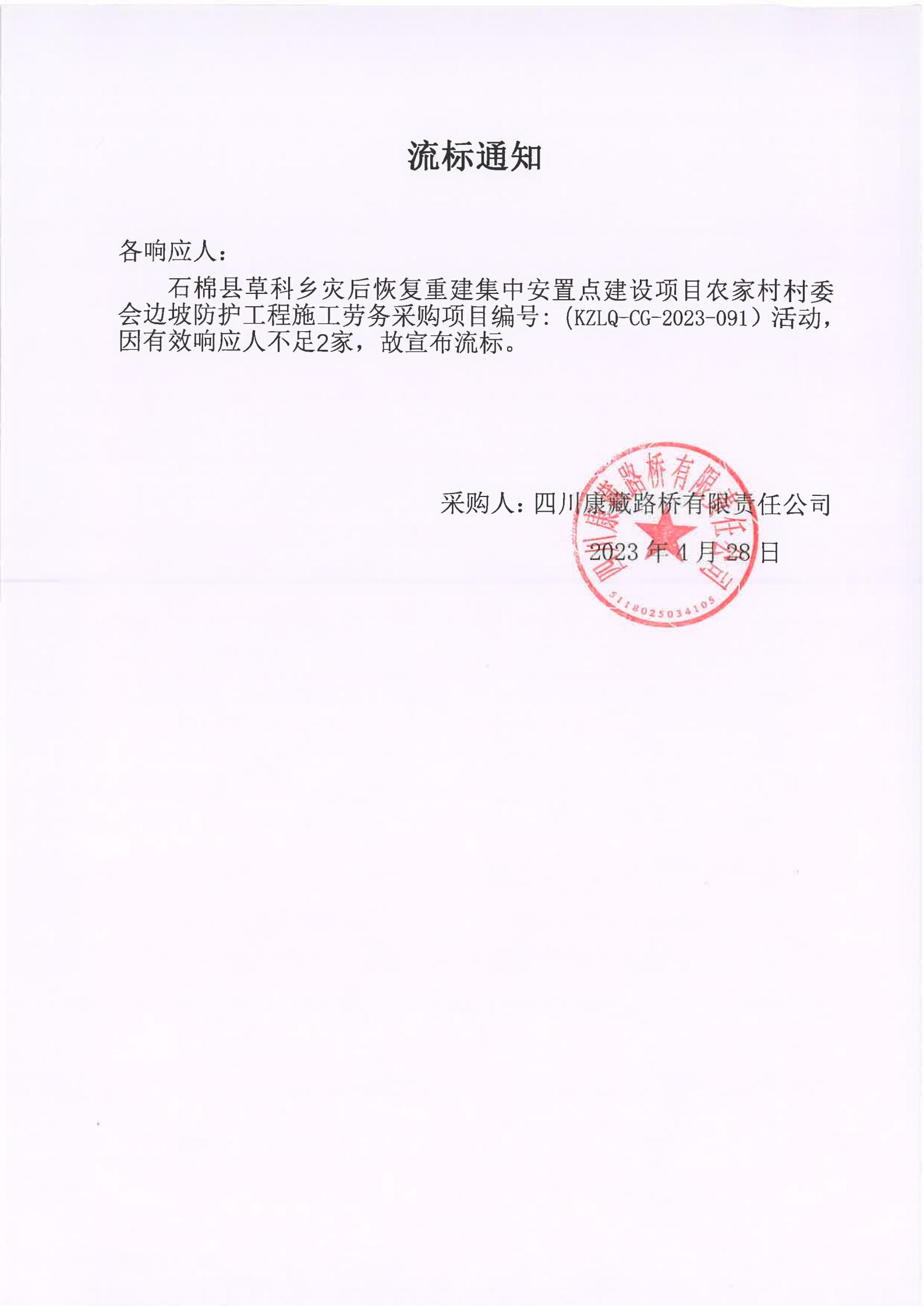 四川康藏路桥有限责任公司石棉草科乡灾后恢复重建集中安置点建设项目农家村村委会边坡防护工程施工劳务流标通知