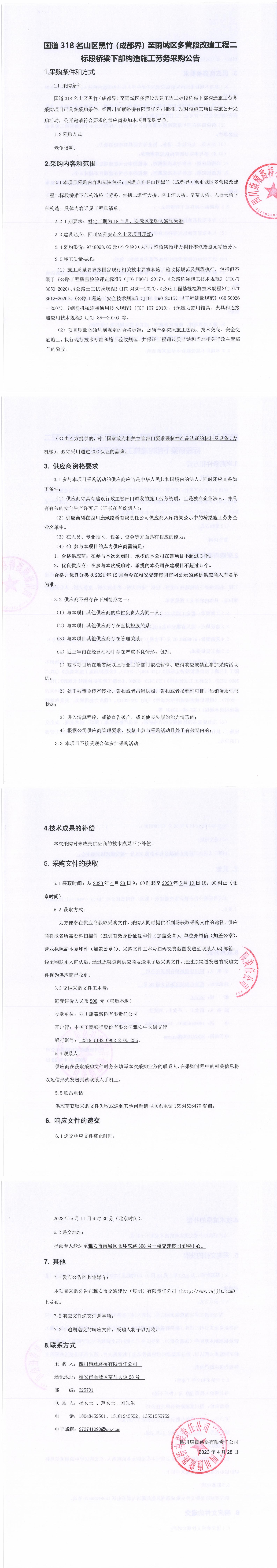 四川康藏路桥有限责任公司国道318名山区黑竹(成都界)至雨城区多营段改建工程二标段桥梁下部构造施工劳务采购公告
