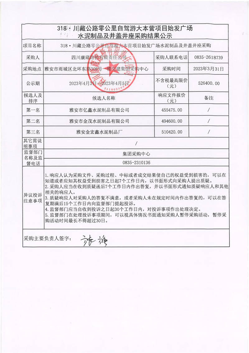 四川康藏路桥有限责任公司318·川藏公路零公里自驾游大本营项目始发广场水泥制品及井盖井座采购结果公示