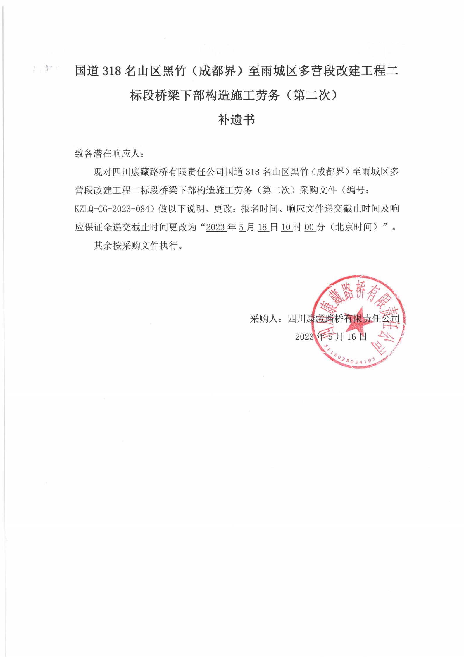 四川康藏路桥有限责任公司国道318名山区黑竹(成都界)至雨城区多营段改建工程二标段桥梁下部构造施工劳务(第二次)补遗书
