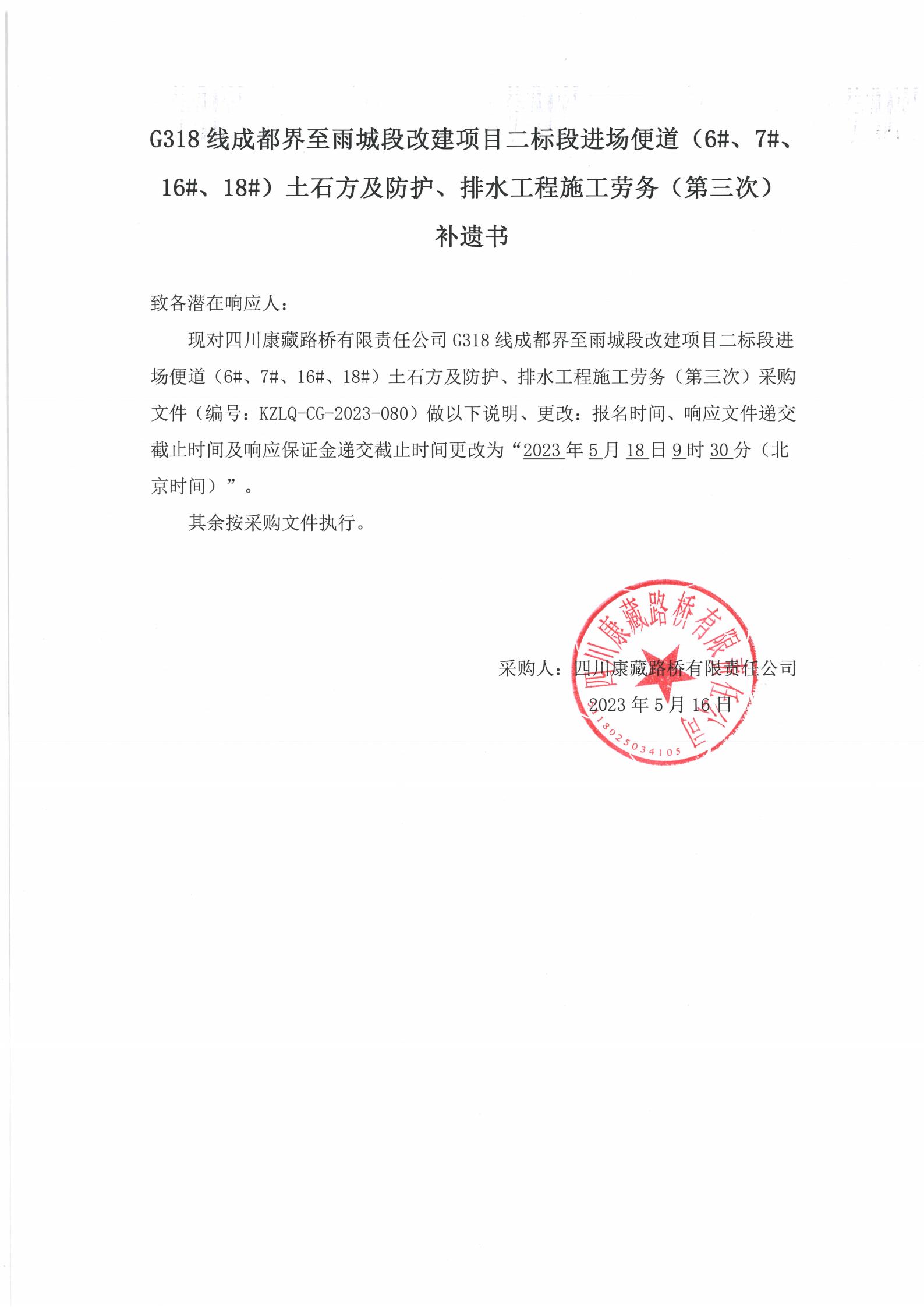四川康藏路桥有限责任公司国道318名山区黑竹(成都界)至雨城区多营段改建工程二标段桥梁下部构造施工劳务(第二次)补遗书