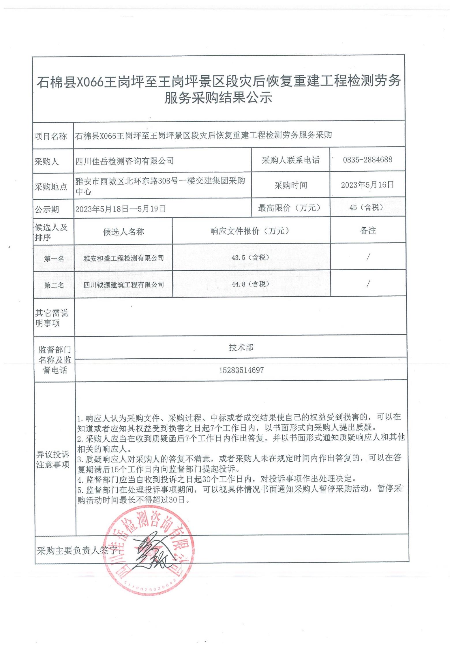 四川佳岳检测咨询有限公司石棉县X066王岗坪至王岗坪景区段灾后恢复重建工程检测劳务服务采购结果公示