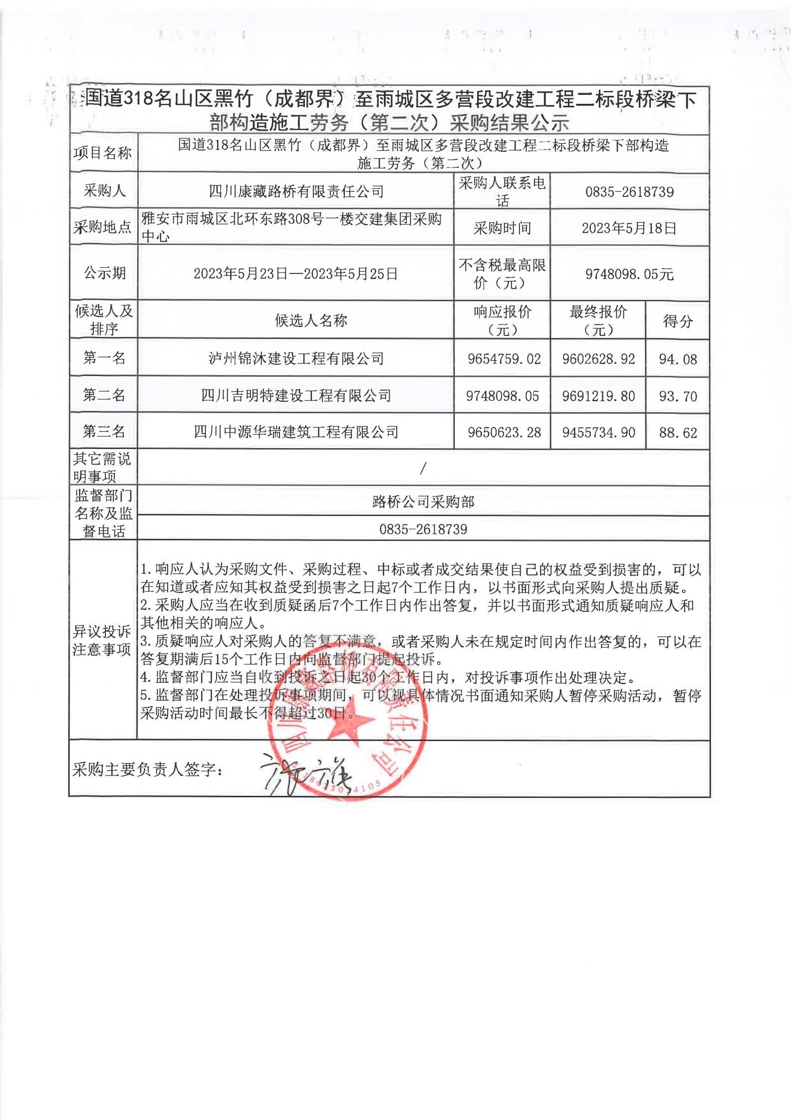 四川康藏路桥有限责任公司国道318名山区黑竹(成都界)至雨城区多营段改建工程二标段桥梁下部构造施工劳务(第二次)采购结果公示