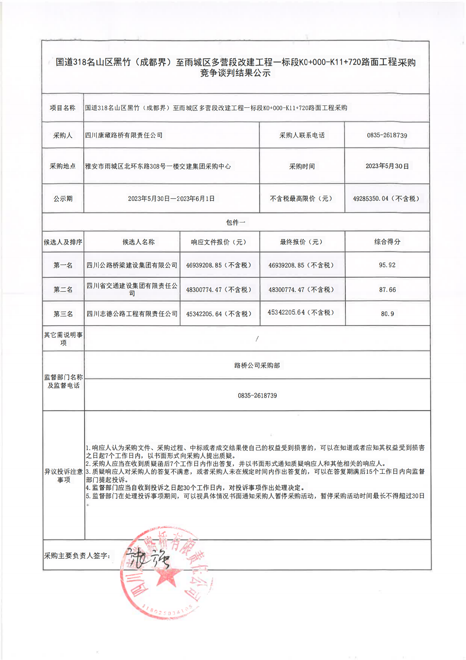 四川康藏路桥有限责任公司国道318名山区黑竹(成都界)至雨城区多营段改建工程一标段K0+000-K11+720路面工程采购竞争谈判结果公示