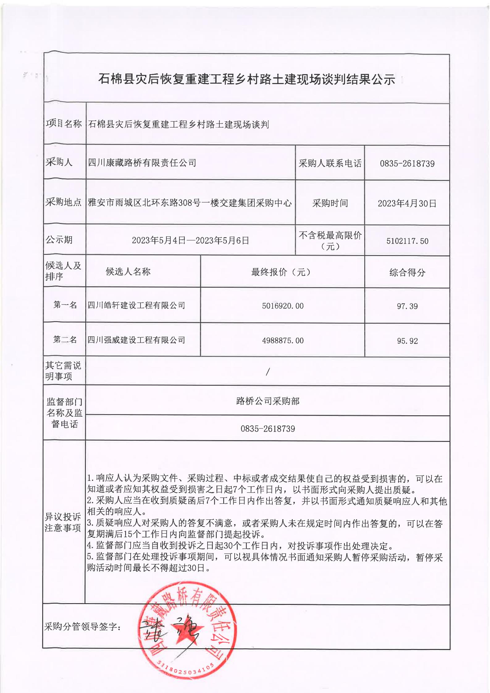 四川康藏路桥有限责任公司石棉县灾后恢复重建工程乡村路土建现场谈判结果公示