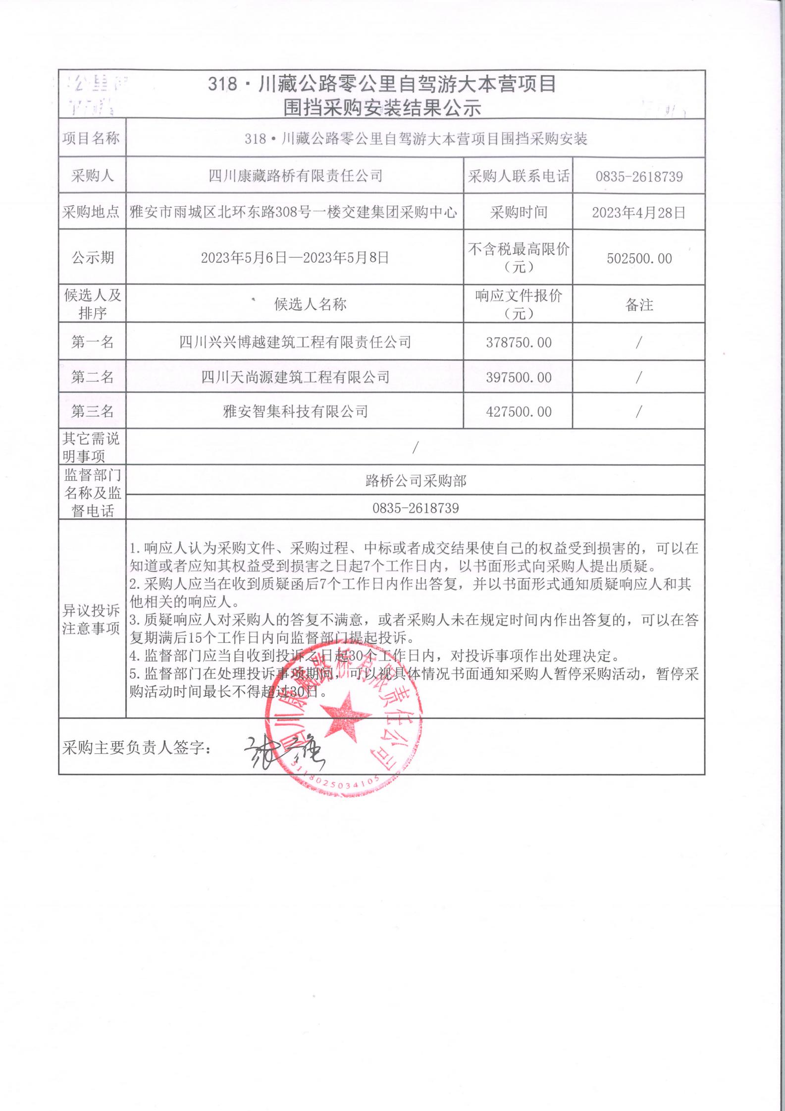 四川康藏路桥有限责任公司318·川藏公路零公里自驾游大本营项目围挡采购安装结果公示