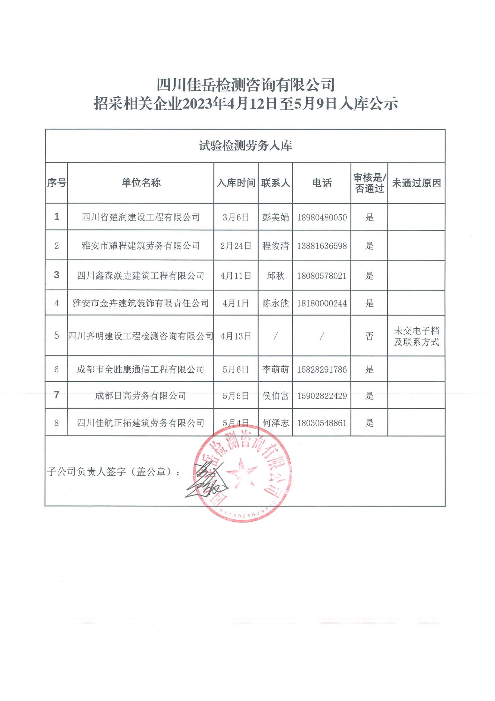 四川佳岳检测咨询有限公司(试验检测劳务供应商库)2023年4月12日至5月9日入库结果公示