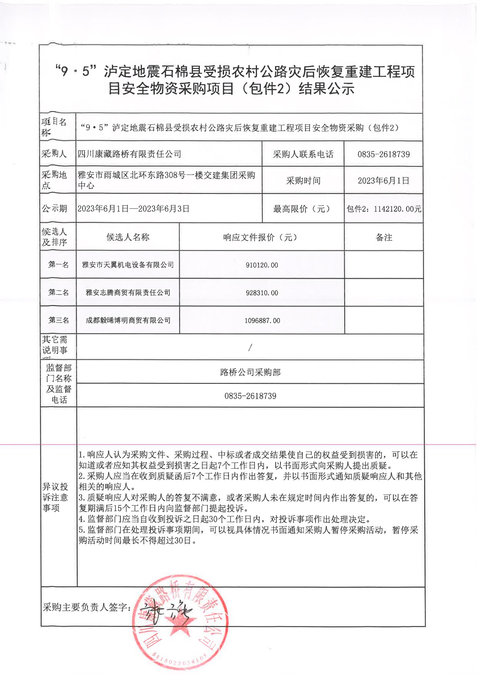 四川康藏路桥有限责任公司“9·5”泸定地震石棉县受损农村公路灾后恢复重建工程项目安全物资项目(包件2)结果公示