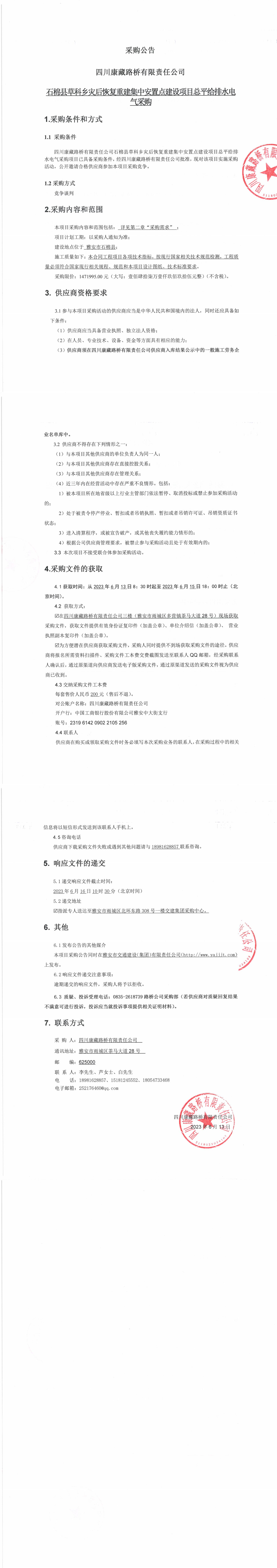 四川康藏路桥有限责任公司石棉县草科乡灾后恢复重建集中安置点建设项目总平给排水电器采购公告