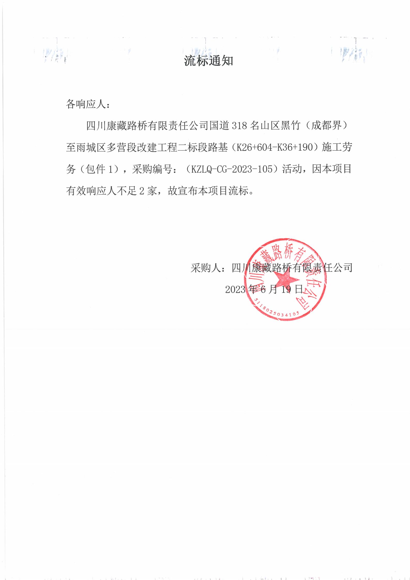 四川康藏路桥有限责任公司国道318名山区黑竹(成都界)至雨城区多营段改建工程二标段路基(K26+604-K36+190)施工劳务采购(包件1)流标通知