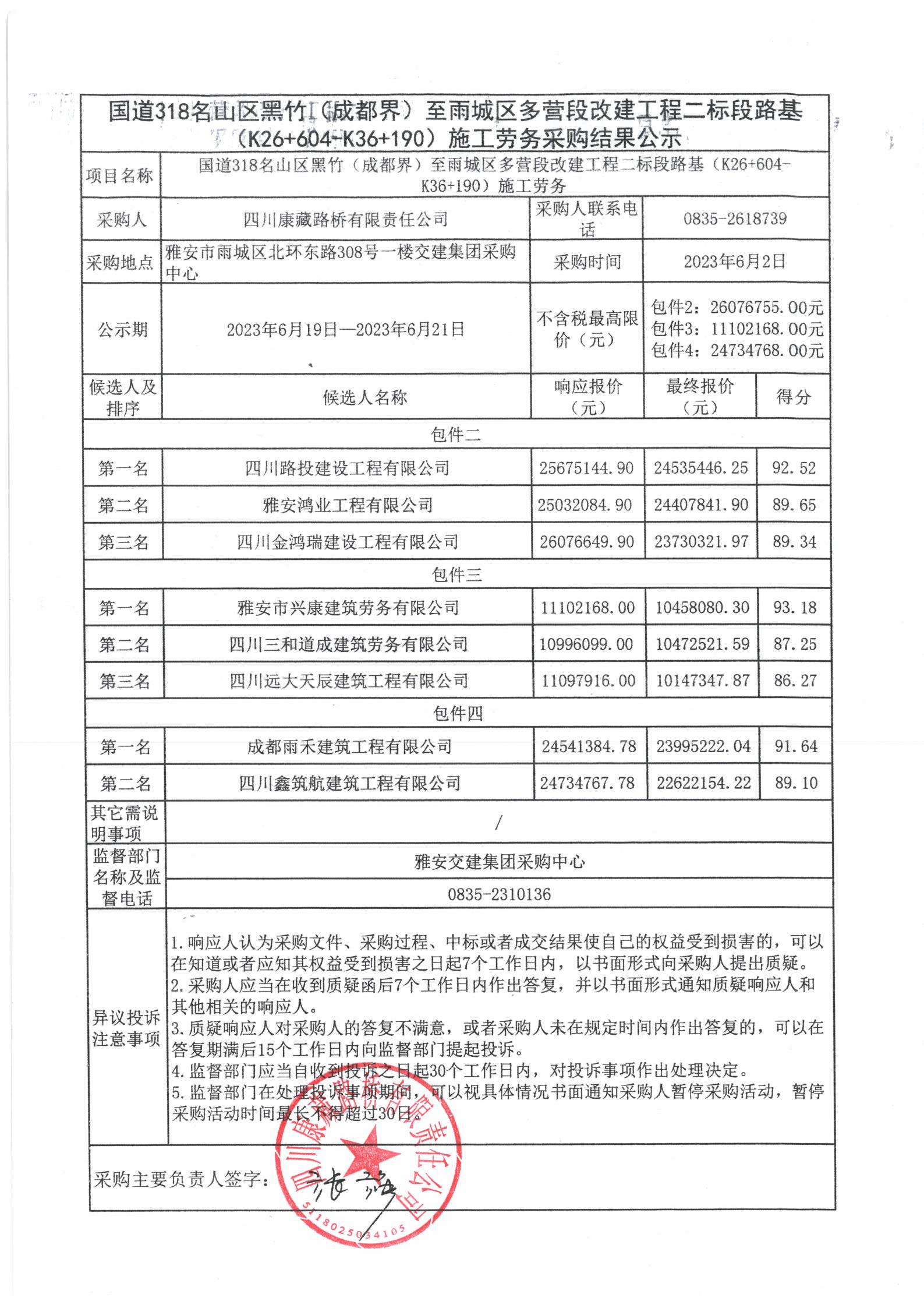 四川康藏路桥有限责任公司国道318名山区黑竹(成都界)至雨城区多营段改建工程二标段路基(K26+604-K36+190)施工劳务采购(包件二、包件三、包件四)结果公示