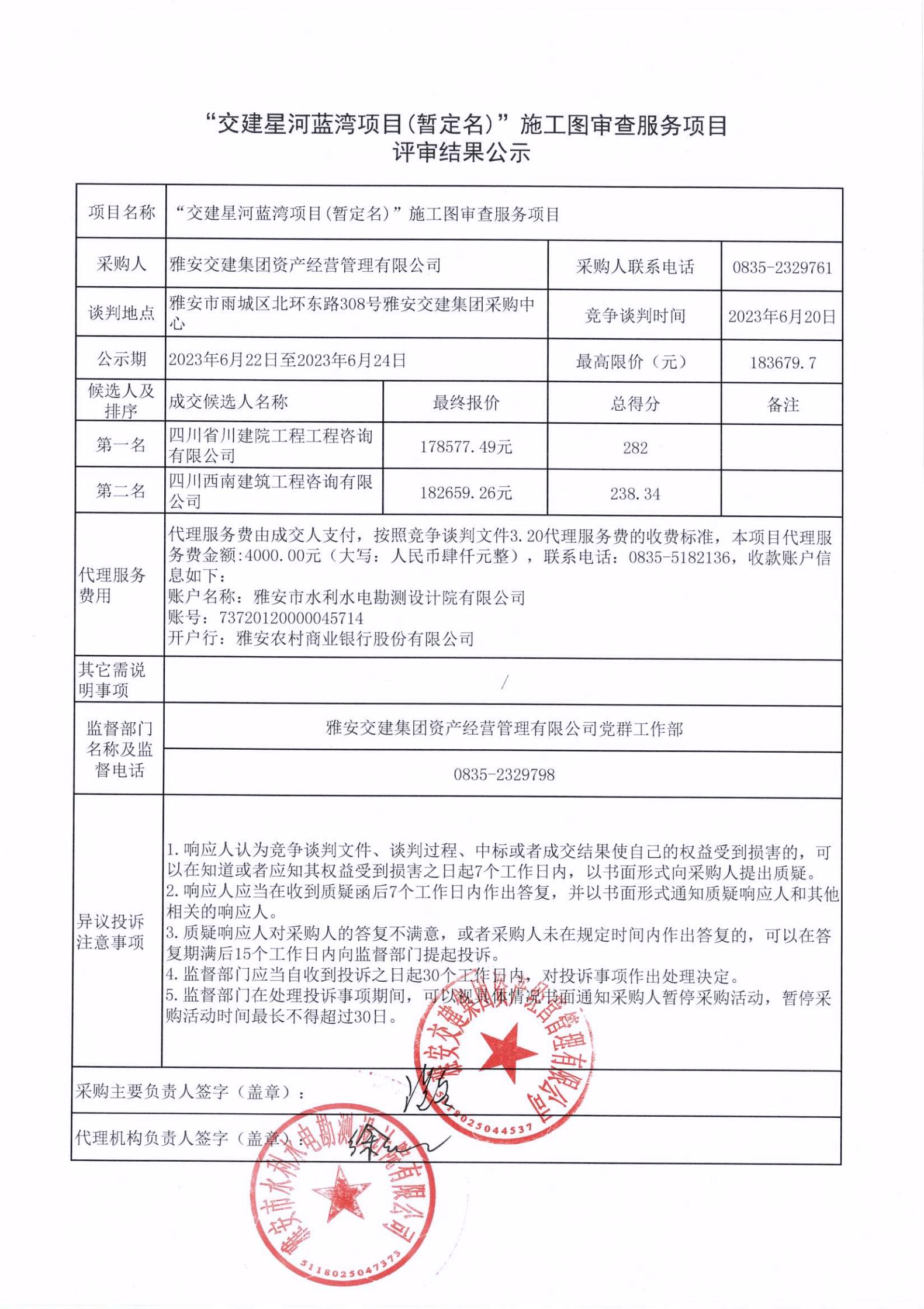 米兰体育-米兰(中国)官网 资产经营管理有限公司“交建星河蓝湾项目(暂定名)”施工图审查服务项目评审结果公示