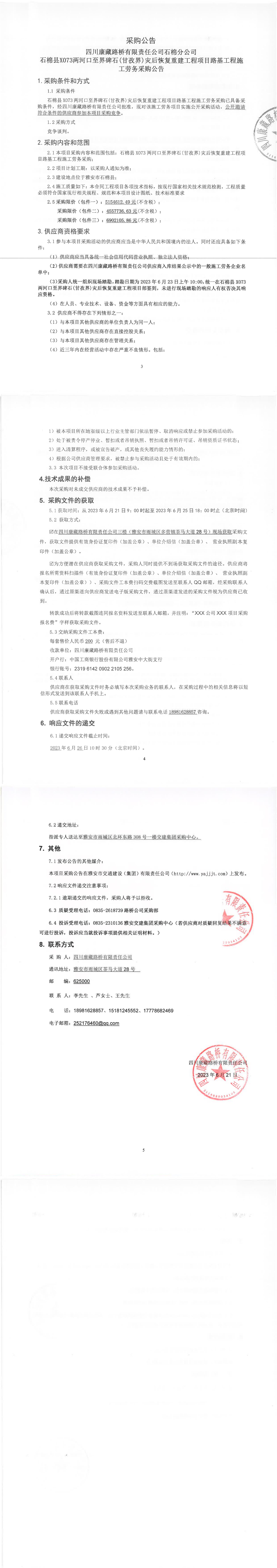 四川康藏路桥有限责任公司石棉分公司石棉县X073两河口至界碑石(甘孜界)灾后恢复重建工程项目路基工程施工劳务采购公告