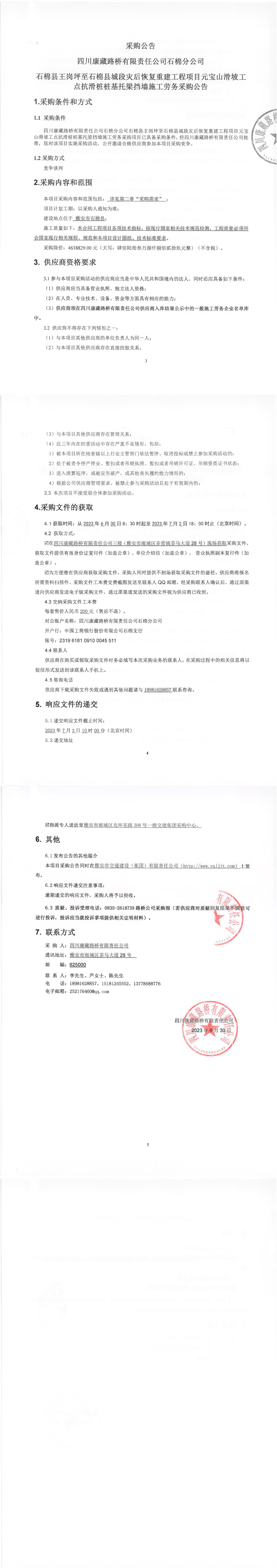 四川康藏路桥有限责任公司石棉县王岗坪至石棉县城段灾后恢复重建工程项目元宝山滑坡工点抗滑桩桩基托梁挡墙施工劳务采购公告