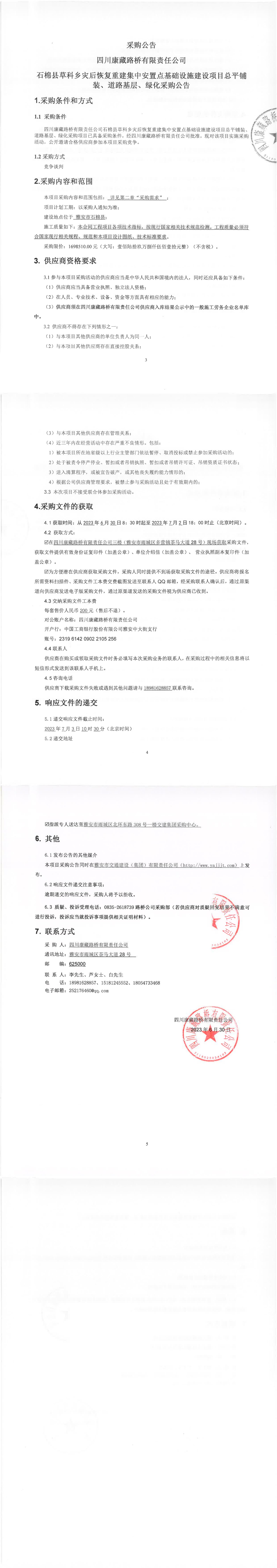 四川康藏路桥有限责任公司石棉县草科乡灾后恢复重建集中安置点基础设施建设项目总平铺装、道路基层、绿化采购公告