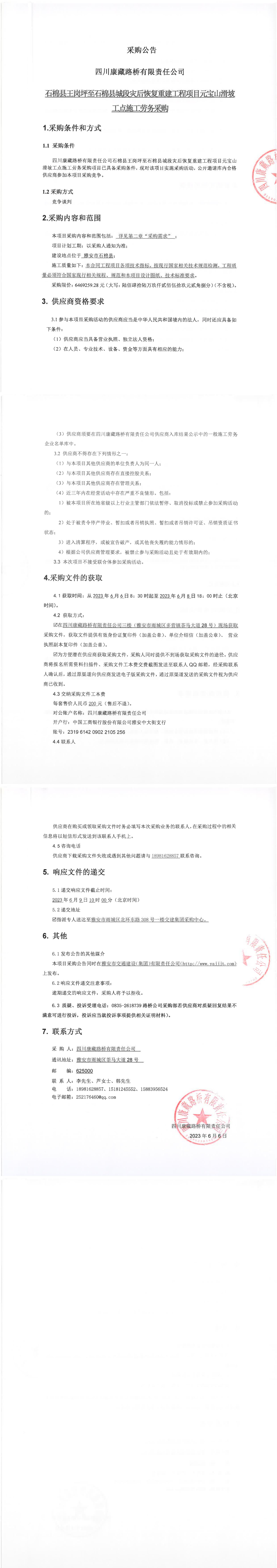 四川康藏路桥有限责任公司石棉县王岗坪至石棉县城段灾后恢复重建工程项目元宝山滑坡工点施工劳务采购
