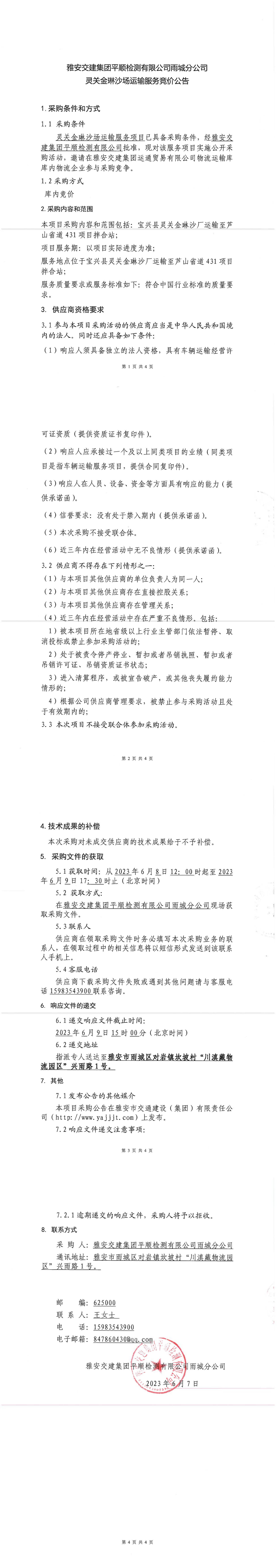 米兰体育-米兰(中国)官网 平顺检测有限公司雨城分公司灵关金琳沙场运输服务竞价公告