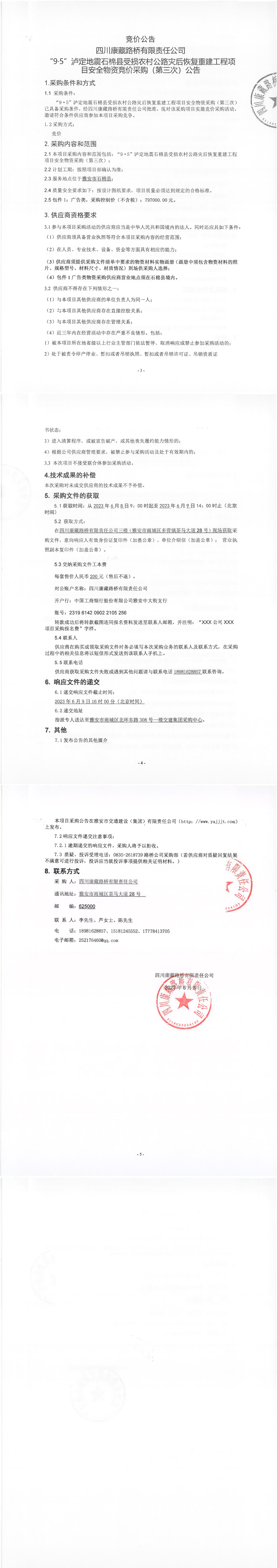 四川康藏路桥有限责任公司“9·5”泸定地震石棉县受损农村公路灾后恢复重建工程项目安全物资竞价采购(第三次)公告