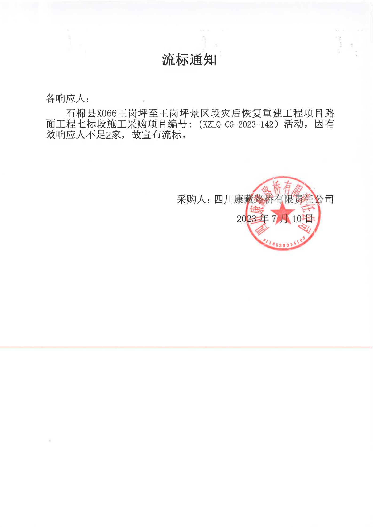 四川康藏路桥有限责任公司石棉县X066王岗坪至王岗坪景区段灾后恢复重建工程项目路面工程七标段施工采购流标通知