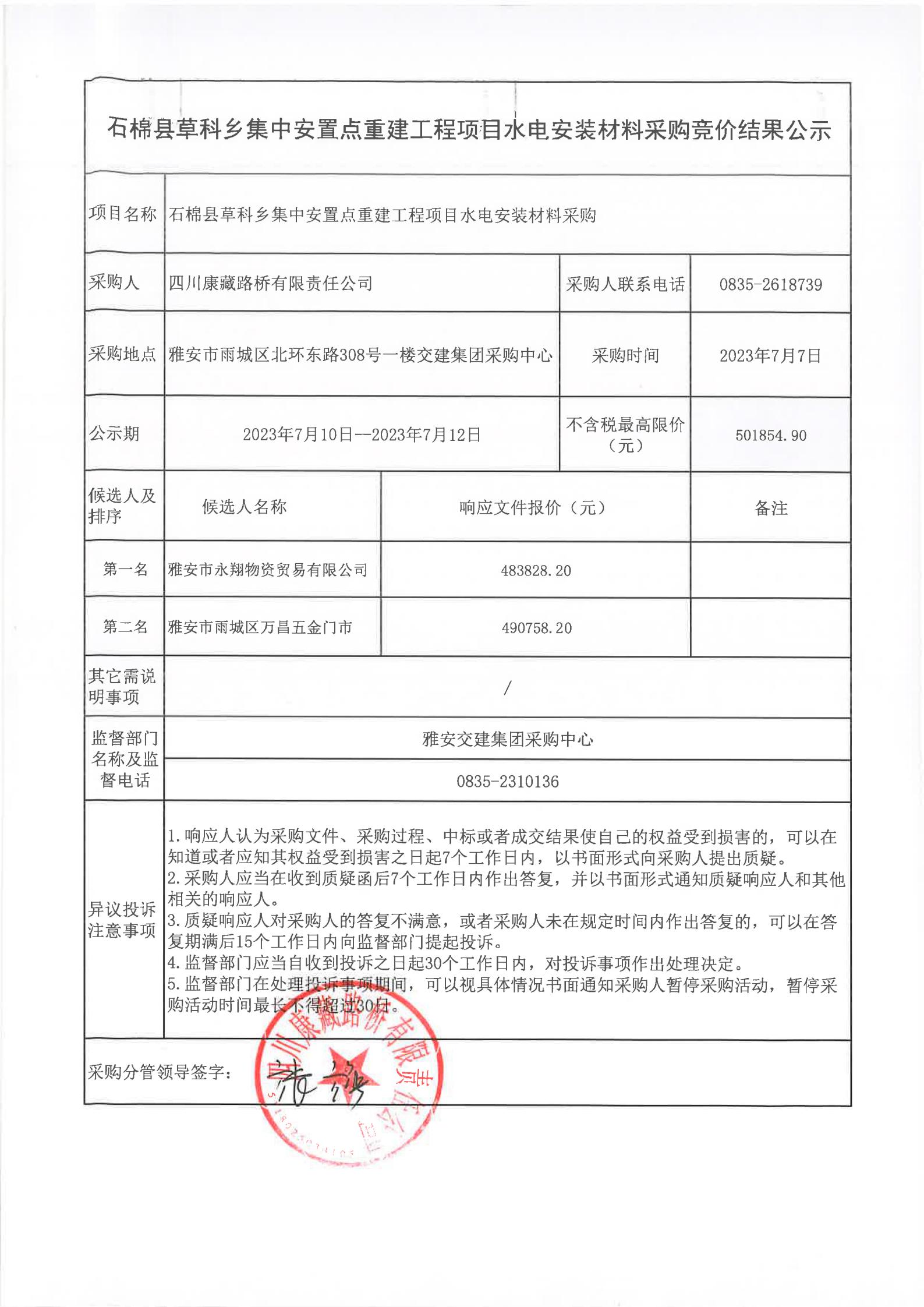 四川康藏路桥有限责任公司石棉草科乡集中安置点重建工程项目水电安装材料采购竞价结果公示