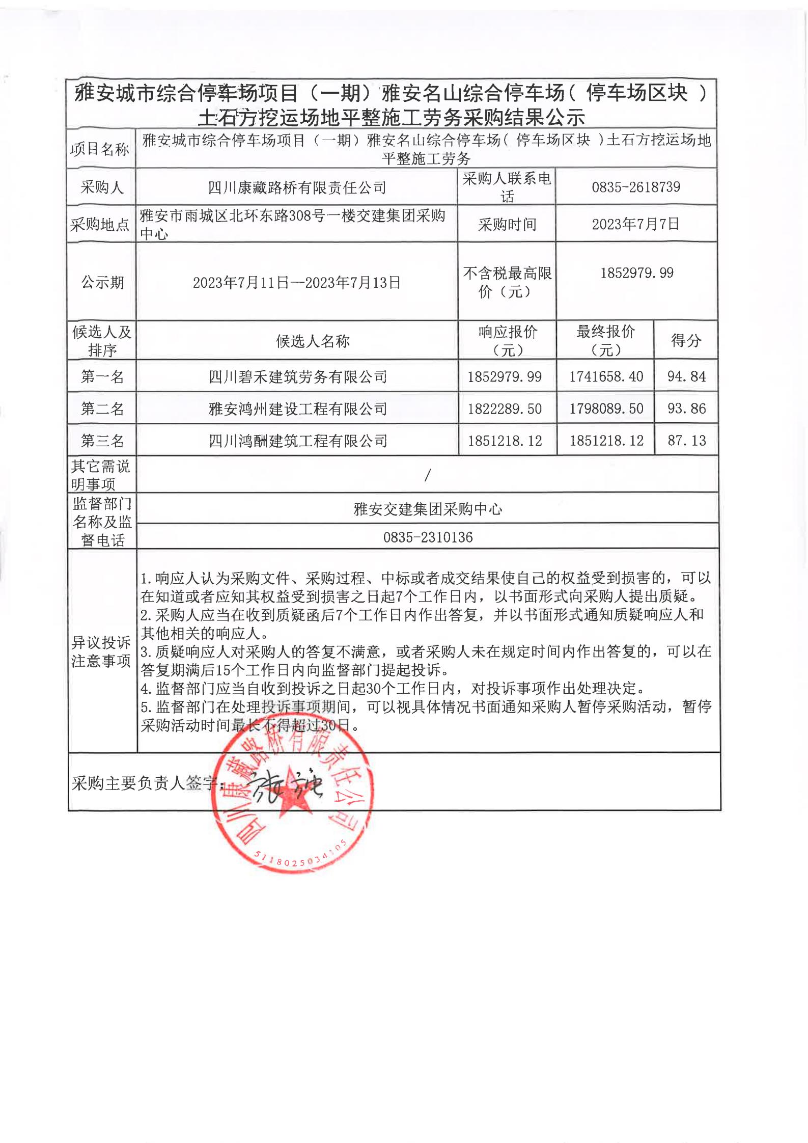 四川康藏路桥有限责任公司雅安城市综合停车场项目(一期)雅安名山综合停车场(停车场区块)土石方挖运场地平整施工劳务采购结果公示