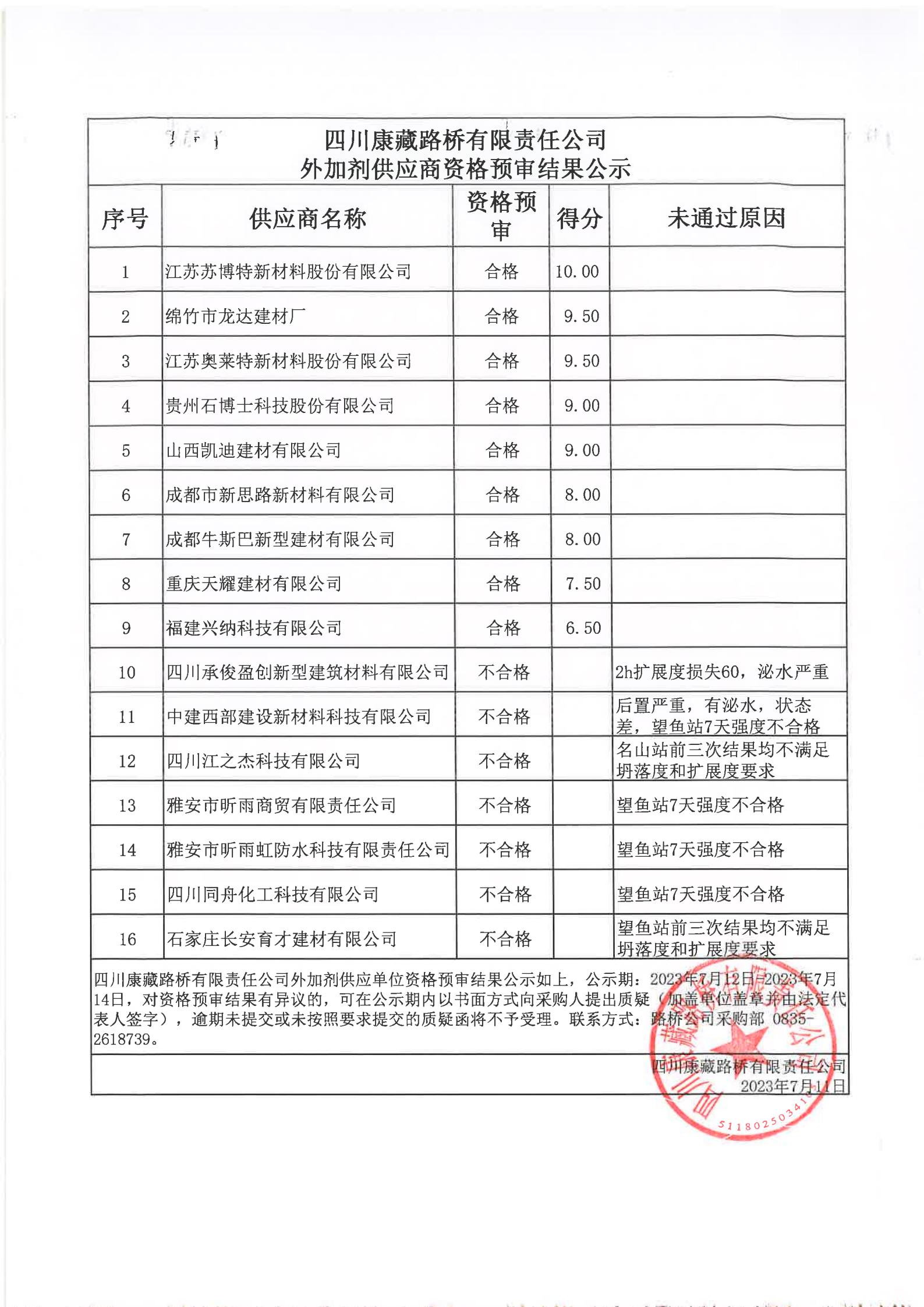 四川康藏路桥有限责任公司外加剂供应商资格预审结果公示