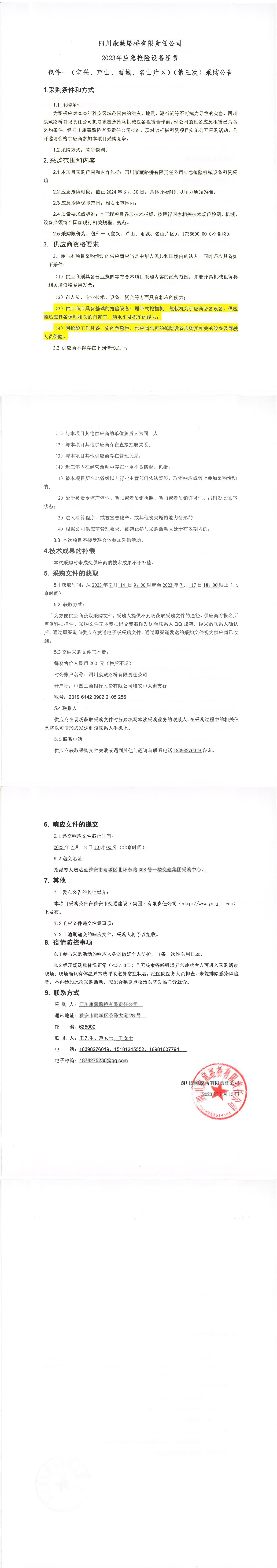 四川康藏路桥有限责任公司2023年应急抢险设备租赁包件一(宝兴、芦山、雨城、名山片区)(第三次)采购公告