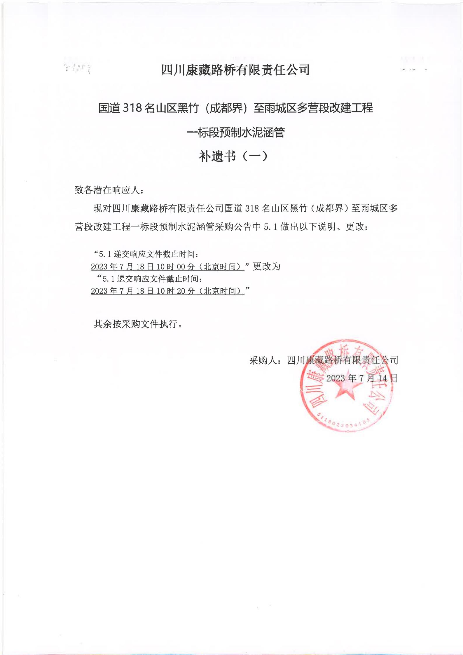 四川康藏路桥有限责任公司国道318名山区黑竹(成都界)至雨城区多营段改建工程一标段预制水泥涵管(补遗书)(一)
