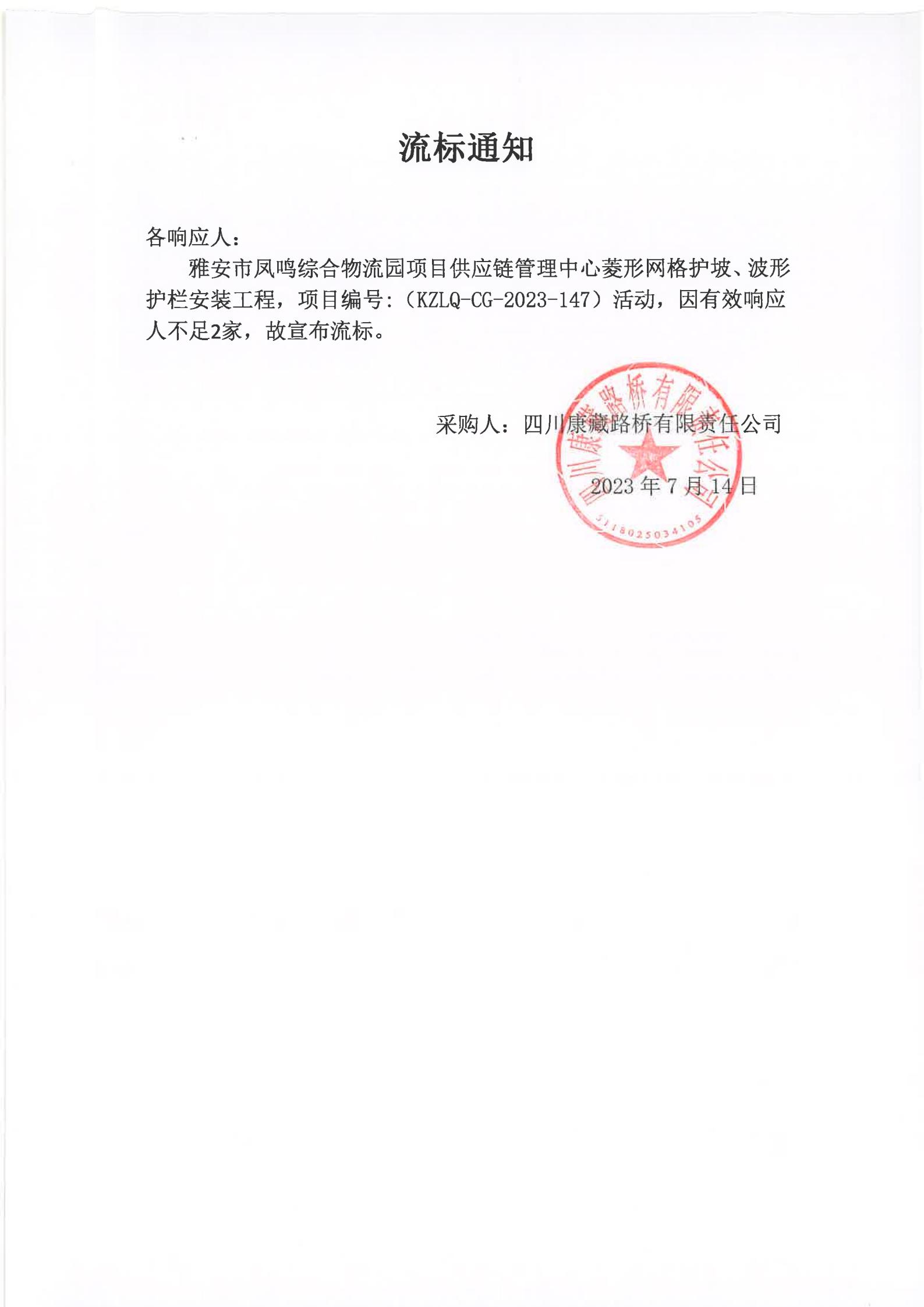 四川康藏路桥有限责任公司雅安市凤鸣综合物流园项目供应链管理中心菱形网格护坡、波形护栏安装工程采购流标通知