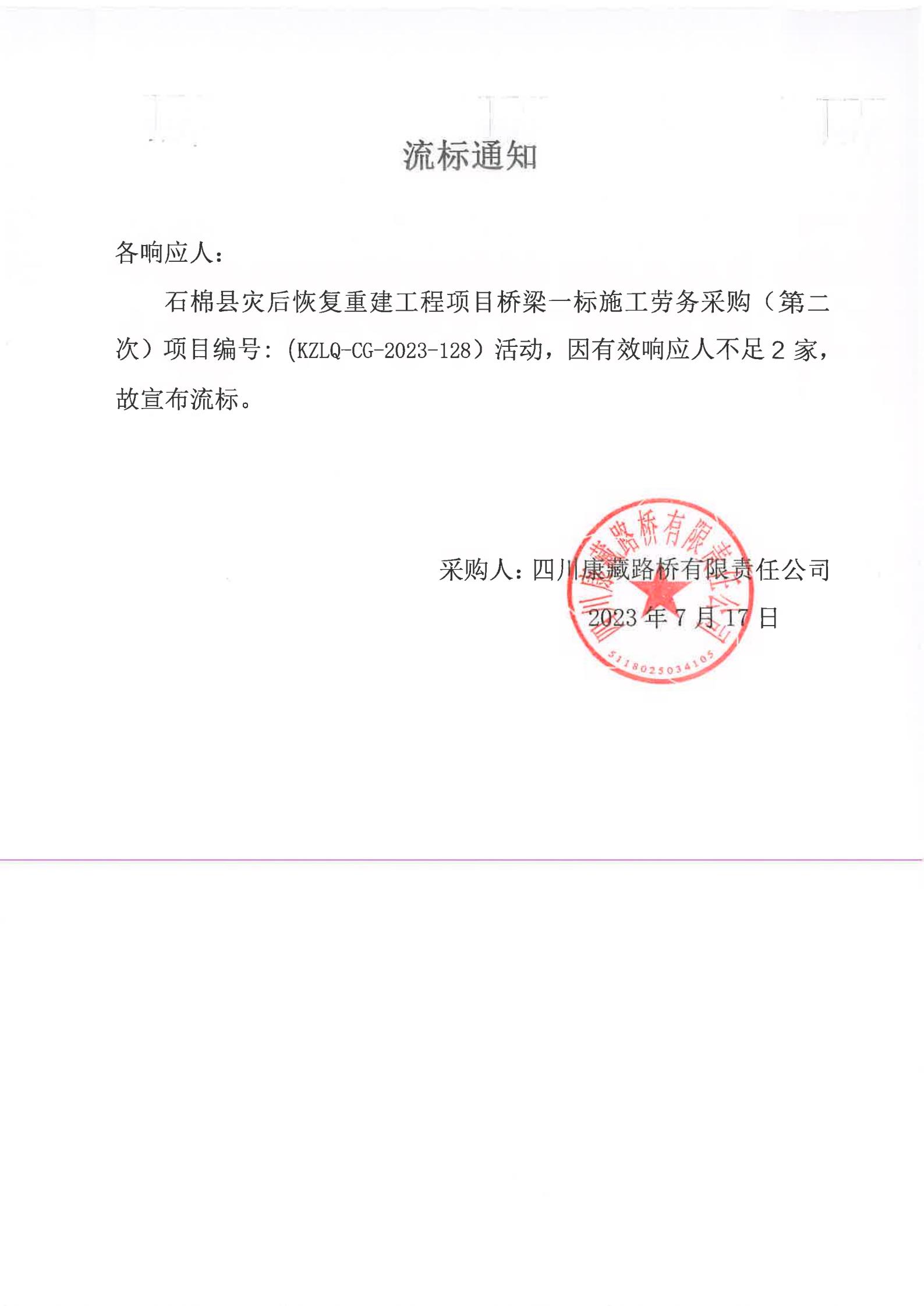 四川康藏路桥有限责任公司石棉县灾后恢复重建工程项目桥梁一标段施工劳务采购(第二次)流标通知