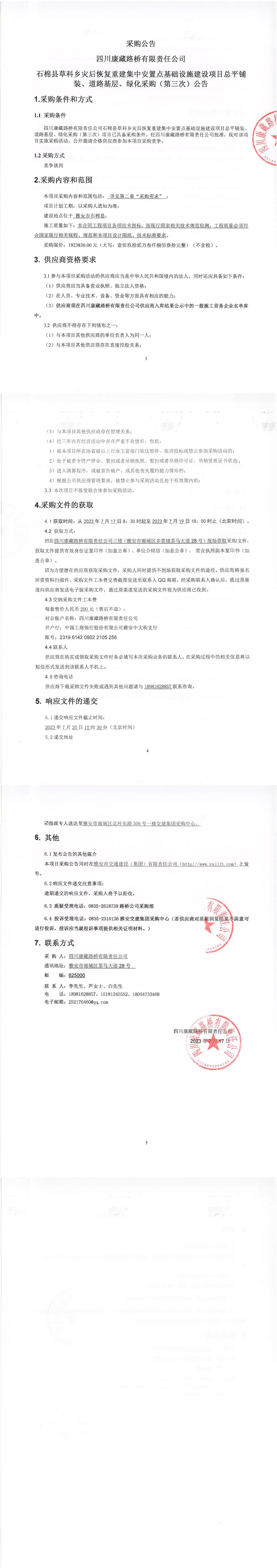 四川康藏路桥有限责任公司石棉县草科乡灾后恢复重建集中安置点基础设施建设项目总平铺装、道路基层、绿化采购(第三次)公告