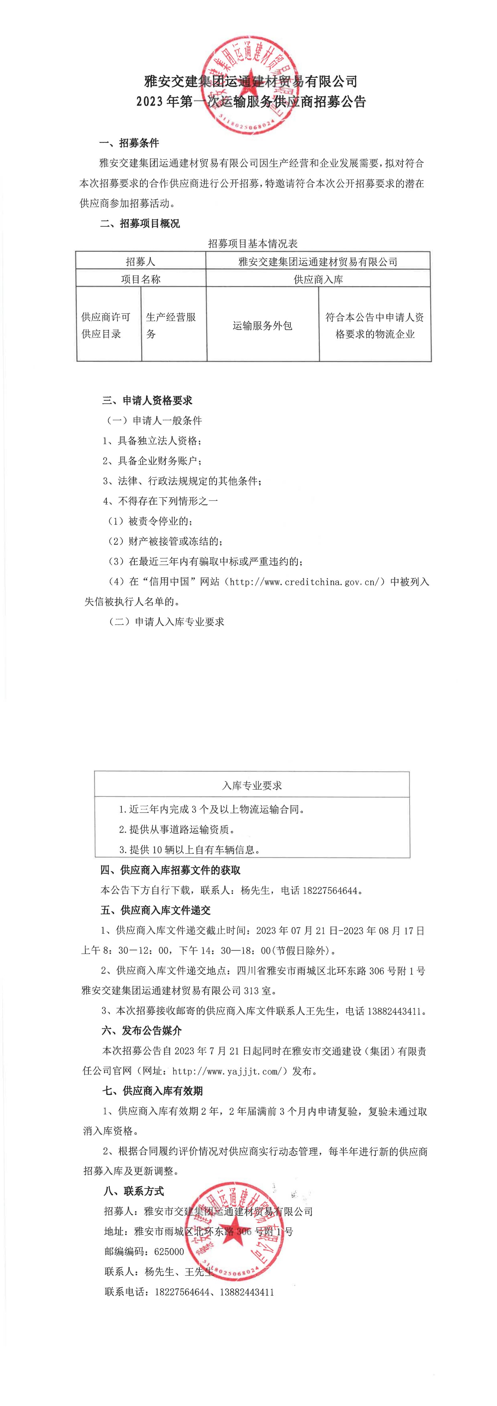 米兰体育-米兰(中国)官网 运通建材贸易有限公司2023年第一次运输服务供应商招募公告
