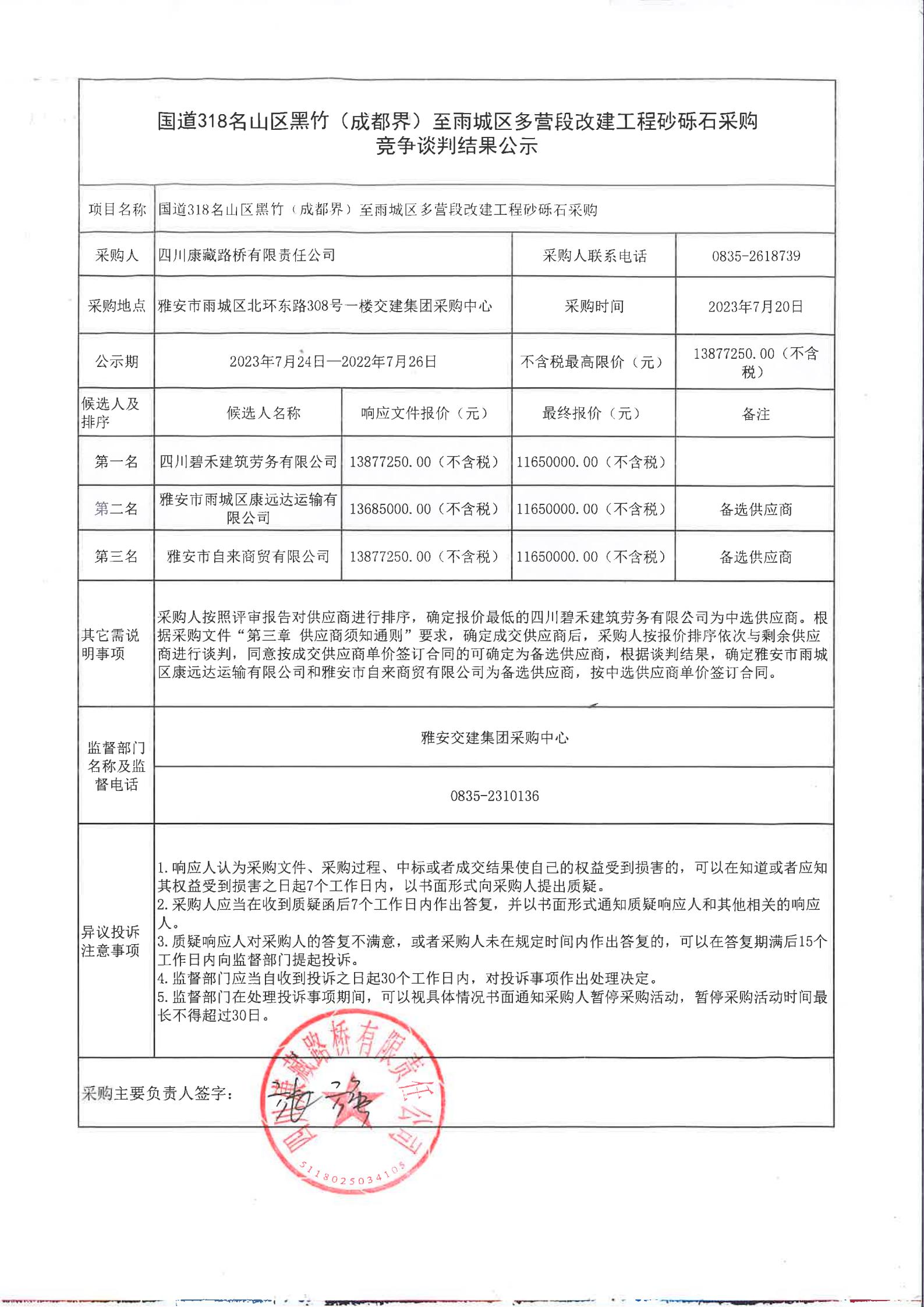 四川康藏路桥有限责任公司国道318名山区黑竹(成都界)至雨城区多营段改建工程砂砾石采购竞争谈判结果公示