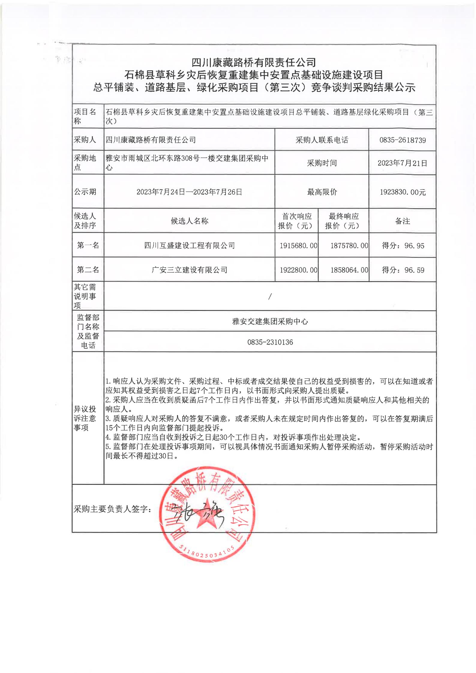 四川康藏路桥有限责任公司石棉县草科乡灾后恢复重建集中安置点基础设施建设项目总平铺装、道路基层、绿化采购项目(第三次)竞争谈判采购结果公示