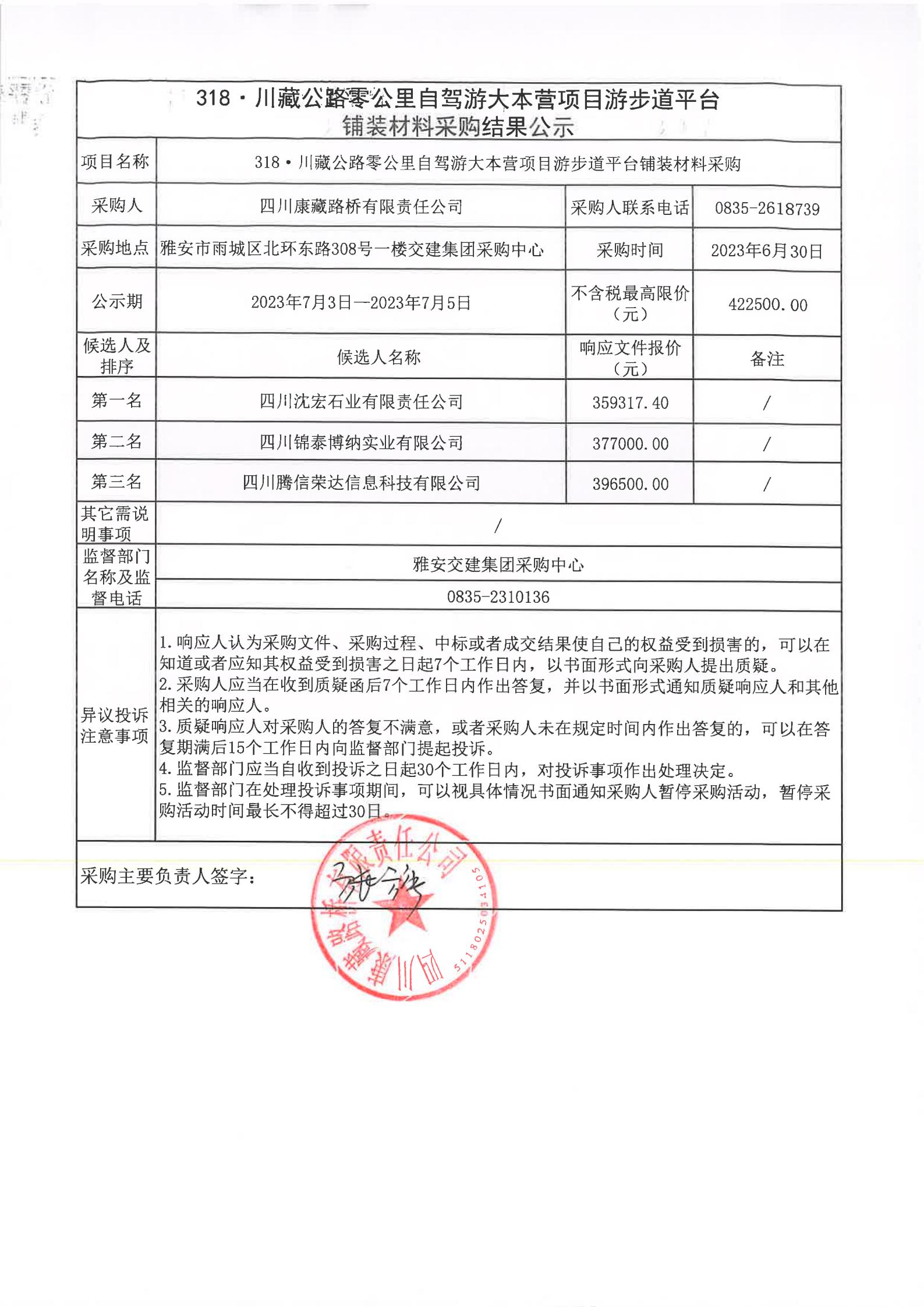 四川康藏路桥有限责任公司318·川藏公路零公里自驾游大本营项目游步道平台铺装材料采购结果公示