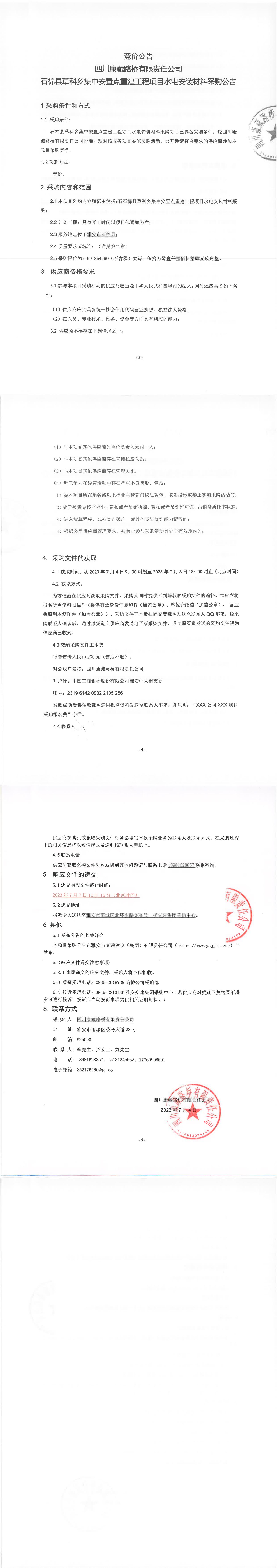 四川康藏路桥有限责任公司石棉县草科乡集中安置点重建工程项目水电安装材料采购公告