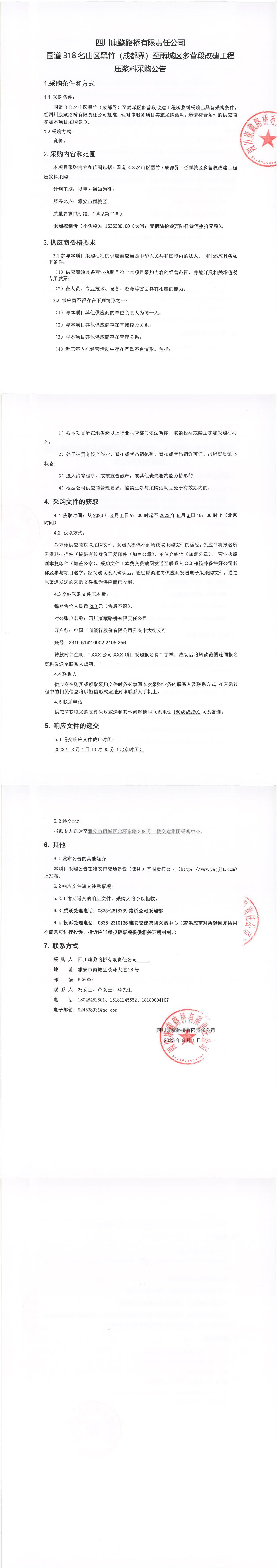 四川康藏路桥有限责任公司国道318名山区黑竹(成都界)至雨城区多营段改建工程压浆料采购公告