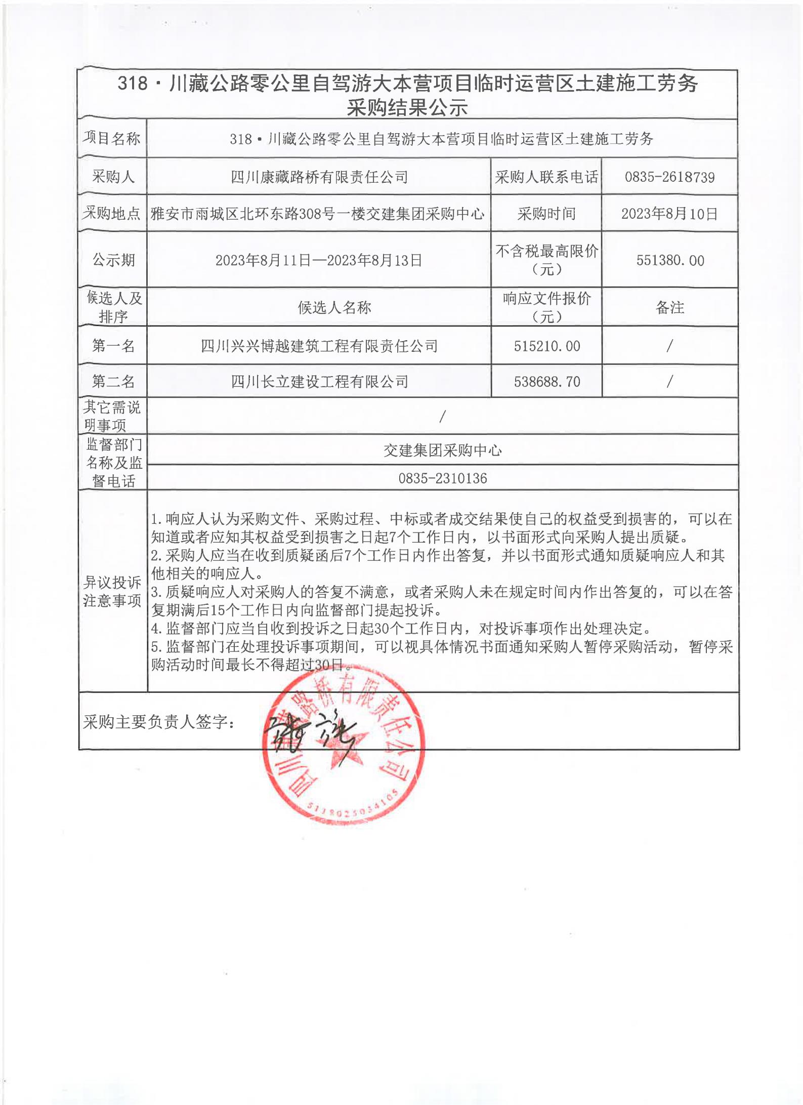 四川康藏路桥有限责任公司318·川藏公路零公里自驾游大本营项目临时运营区土建施工劳务采购结果公示