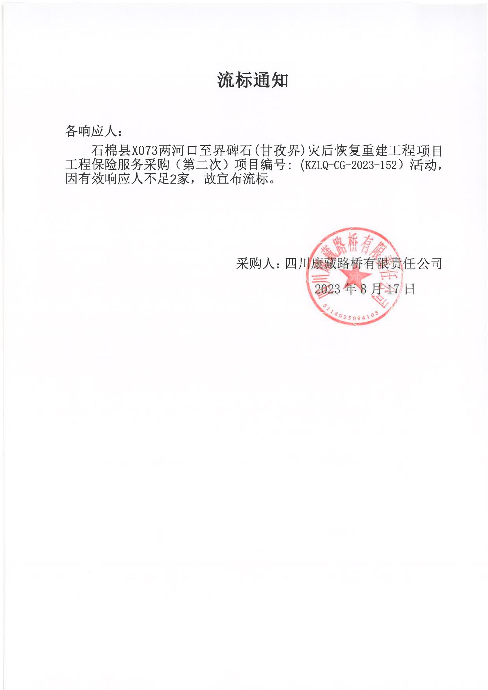 四川康藏路桥有限责任公司石棉县X073两河口至界碑石(甘孜界)灾后恢复重建工程项目工程保险服务采购(第二次)流标通知