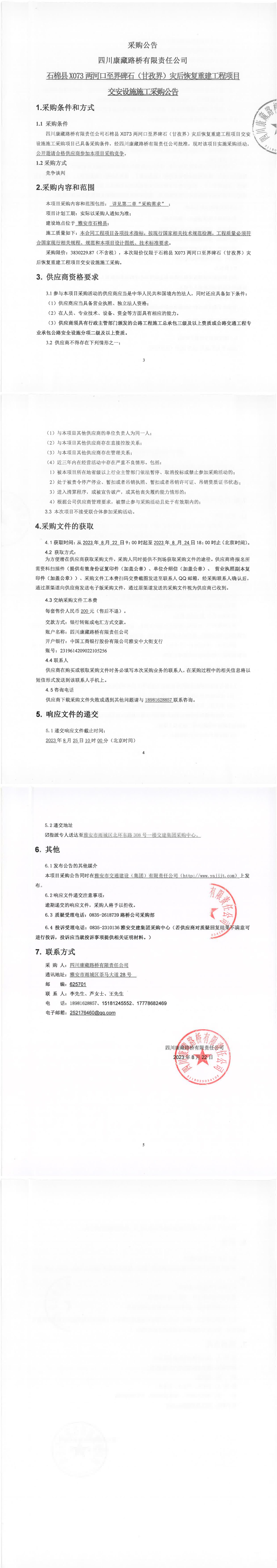 四川康藏路桥有限责任公司石棉县X073两河口至界碑石(甘孜界)灾后恢复重建工程项目交安设施施工采购公告