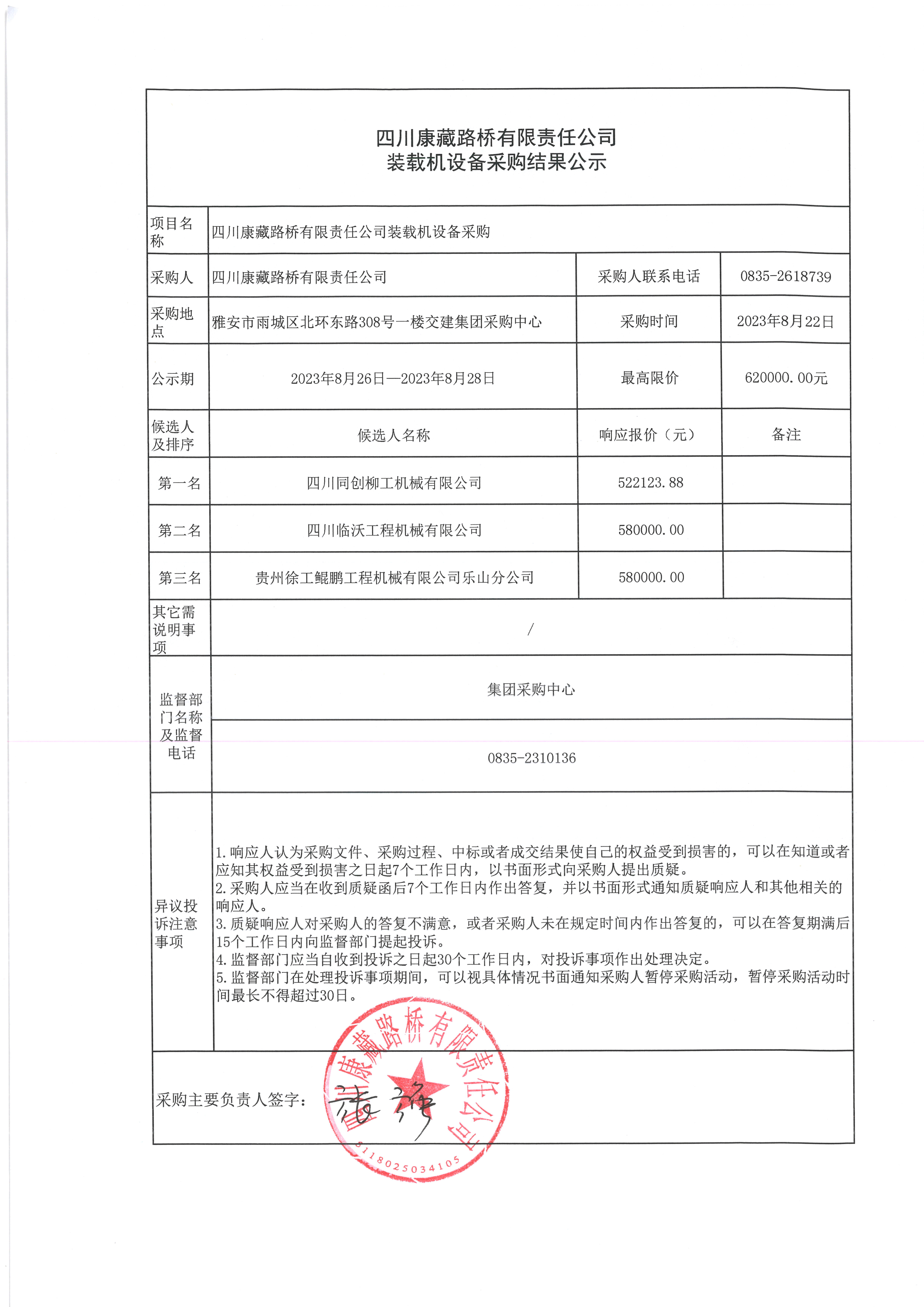 四川康藏路桥有限责任公司装载机设备采购结果公示