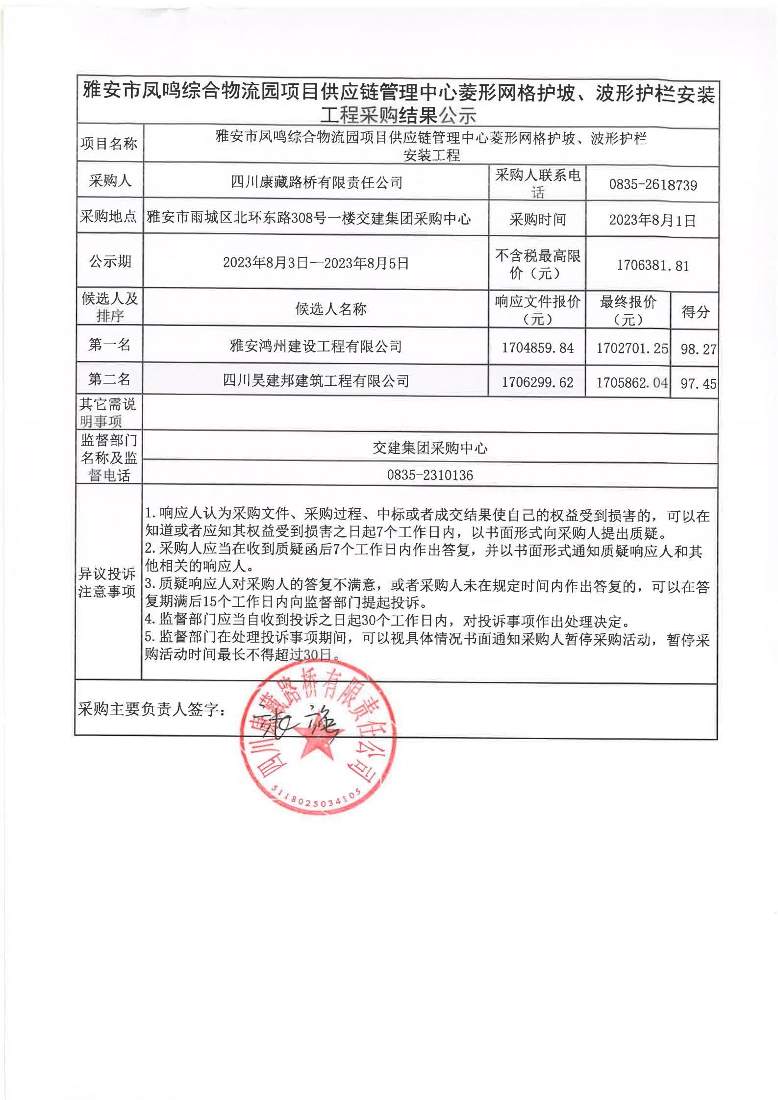 四川康藏路桥有限责任公司雅安市凤鸣综合物流园项目供应链管理中心菱形网格护坡、波形护栏安装工程采购结果公示
