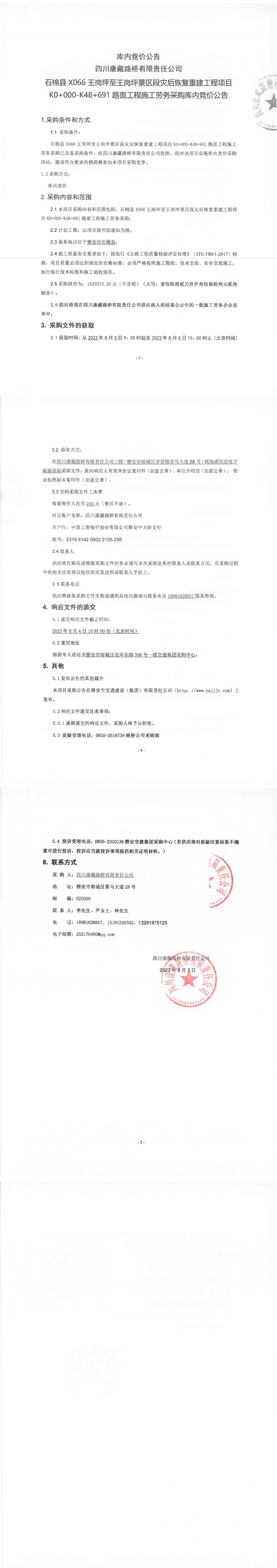 四川康藏路桥有限责任公司石棉县X066王岗坪至王岗坪景区段灾后恢复重建工程项目K0+000-K48+691路面工程施工劳务采购库内竞价公告