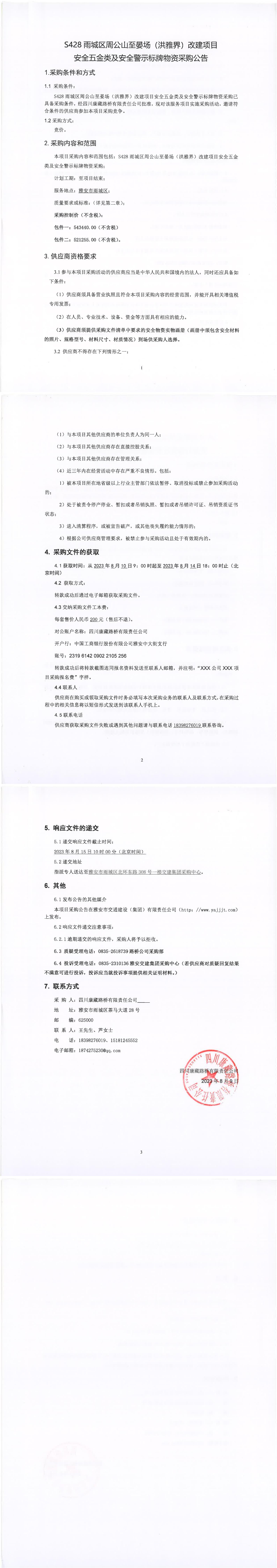 四川康藏路桥有限责任公司S428雨城区周公山至宴场(洪雅界)改建项目安全五金类及安全警示标牌物资采购公告
